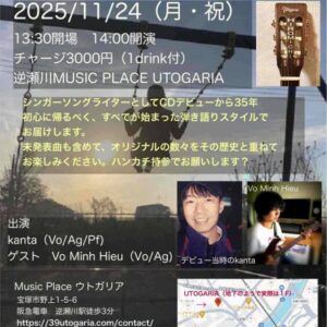Kanta弾き語りLIVE:還暦前夜祭特別企画 Personnel kanta (Vo/AG/Pf)ゲスト:Vo Minh Jieu (Vo/AG) Stage Time 開場 :13:30~開演: 14:00~ Fee 3,000円(1ドリンク付) ... 2025年11月24日(月) 1:30 PM