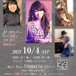 Utogaria 2nd Anniversary Special Live 2 Personnel カヨ クロチェット(ヴォーカル) 山下 正恵(ピアノ) 真木 毅(ベース)kanta(ドラム) Stage Time OPEN:15:30 / START:16:30~ Fee 2,500円(1ドリン […] ... 2025年10月04日(土) 3:30 PM