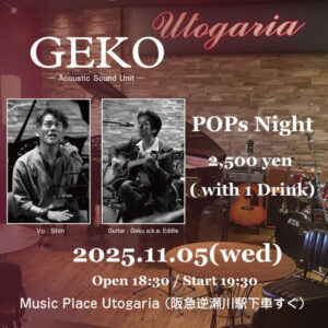 GEKO「POPs Night」 Profile 2018年から京都で開催されていたイベント「京ノ夜会」から派生して結成された最小サウンドユニット。主に70年代以降の和洋ポップス、ビートルズナンバーなどをレパートリーとして活動中。ユニット名は2人ともお酒 […] ... 2025年11月05日(水) 6:30 PM