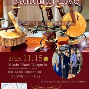 秋葵トリオ Autumn Live Personnel 松永 嘉奈子 (二胡)文堂 美奈 (大阮)河村 敬子 (ピアノ) Stage Time OPEN:14:30 / START:15:00~ Fee 3,000円(ドリンク付) ... 2025年11月15日(土) 2:30 PM