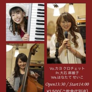 Jazz Live:カヨ クロチェット(Vo)/大石麻維子(Pf)/はなたて せいこ(Wb) Personnel カヨ クロチェット(Vo)大石麻維子(Pf)はなたて せいこ(Wb) Stage Time OPEN:13:30 / START:14:00~ Fee 2,500円(飲食代別途) ... 2025年10月12日(日) 1:30 PM