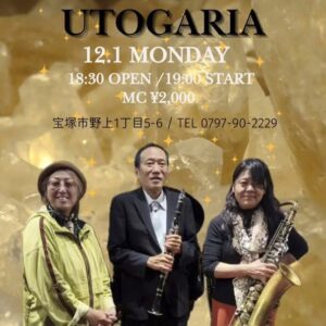 滝川雅弘(Cl) / 藤井美穂(Piano&Vo) / 松尾愛(T.Sax) JAZZ LIVE Personnel 滝川雅弘(クラリネット)藤井美穂(ピアノ&ヴォーカル)松尾愛(テナーサックス) Stage Time 18:30 OPEN / 19:00 START Fee 2,000円 ... 2025年12月01日(月) 6:30 PM