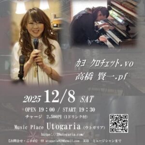 Christmas Live:カヨ クロチェット(Vo)/高橋 賢一(Pf) Personnel カヨ クロチェット(Vo)高橋 賢一(Pf) Stage Time OPEN:19:00 / START:19:30~ Fee 2,500円(1ドリンク付) ... 2025年12月08日(月) 7:00 PM