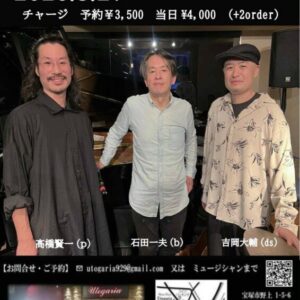 Freedom Mode Trio Personnel 髙橋賢一(pf)石田一夫(b) 吉岡大輔(ds) Stage Time OPEN:18:30 / START:19:30~ Fee 予約:3,500円 / 当日:4,000円 (+2order) ... 2026年3月27日(金) 6:30 PM