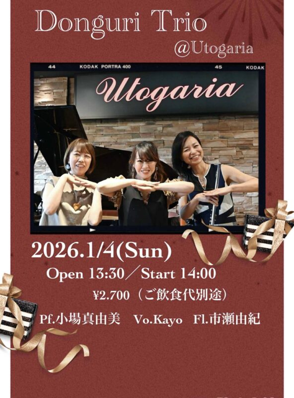 Home Music Place Utogaria -Live Schedule- - Music Place Utogaria(ウトガリア)|宝塚・逆瀬川|ライブハウス Jazz Donguri Trio Donguri Trio Personnel カヨ クロチェット(Vo)小場真由美(Pf)市瀬由紀(Fl) Stage Time OPEN:13:30 / START:14:00~ Fee 2,700円(飲食代別途) + Add to Google Calendar + iCal / Outlook export The event is finished. Date 2026年1月04日 (日曜日) Expired! Time 1:30 PM Category Jazz Share this event