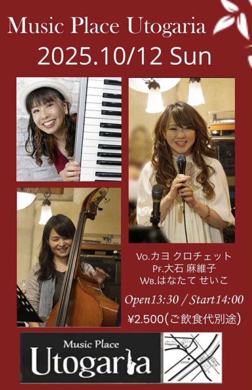 Home Music Place Utogaria -Live Schedule- - Music Place Utogaria(ウトガリア)|宝塚・逆瀬川|ライブハウス Jazz Jazz Live:カヨ クロチェット(Vo)/大石麻維子(Pf)/はなたて せいこ(Wb) Jazz Live:カヨ クロチェット(Vo)/大石麻維子(Pf)/はなたて せいこ(Wb) Personnel カヨ クロチェット(Vo)大石麻維子(Pf)はなたて せいこ(Wb) Stage Time OPEN:13:30 / START:14:00~ Fee 2,500円(飲食代別途) + Add to Google Calendar + iCal / Outlook export The event is finished. Date 2025年10月12日 (日曜日) Expired! Time 1:30 PM Category Jazz Share this event
