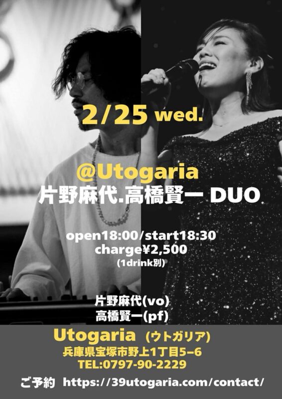Home Music Place Utogaria -Live Schedule- - Music Place Utogaria(ウトガリア)|宝塚・逆瀬川|ライブハウス Jazz 片野麻代、高橋賢一DUO 片野麻代、高橋賢一DUO Personnel 片野麻代(Vo)高橋賢一(Pf) Stage Time OPEN:18:00START:18:30~ Fee 2,500円(1ドリンク別) + Add to Google Calendar + iCal / Outlook export Date 2026年2月25日 (水曜日) Time 6:00 PM Category Jazz Share this event